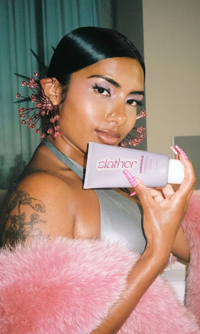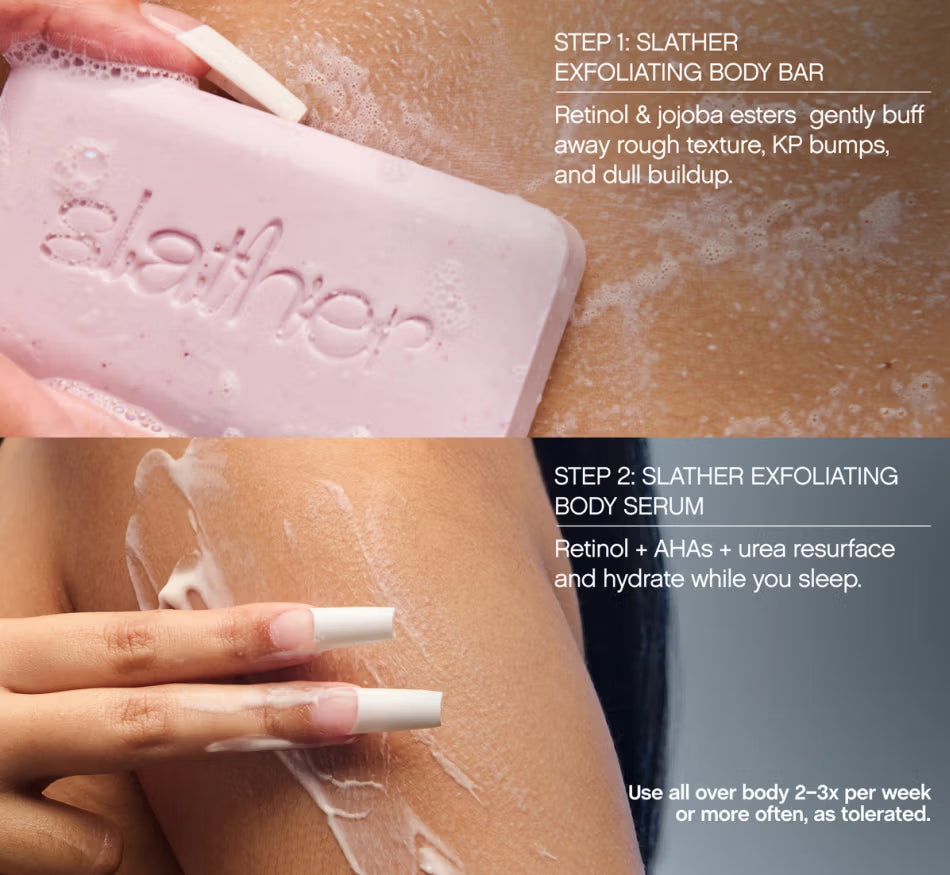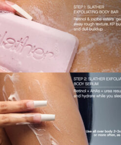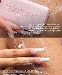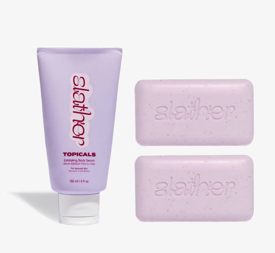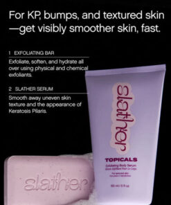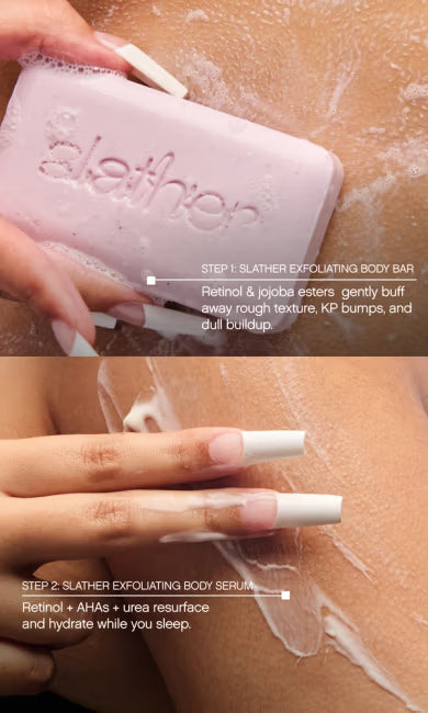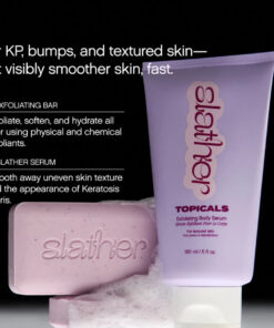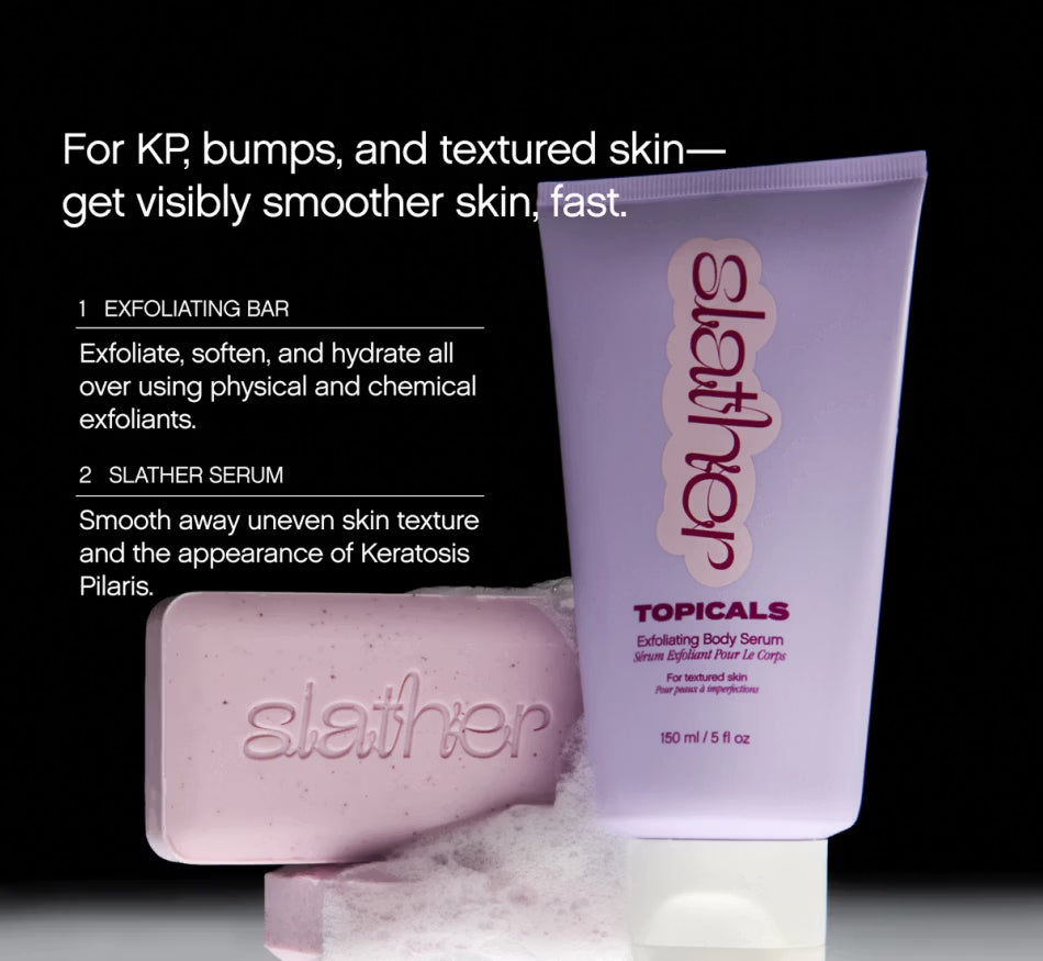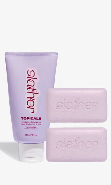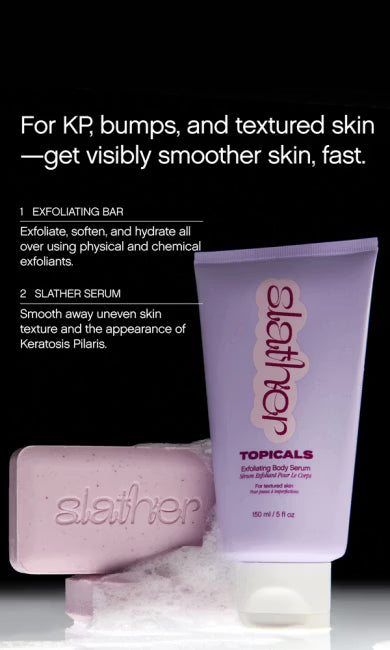 This duo pairs the Slather Exfoliating & Smoothing Bar and Slather Exfoliating Serum to gently exfoliate, hydrate, and visibly smooth textured skin and KP.